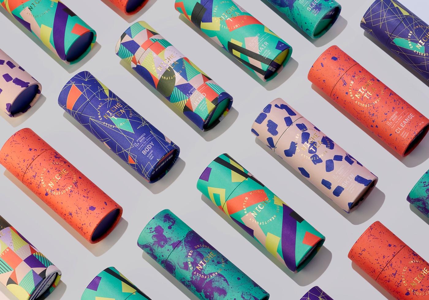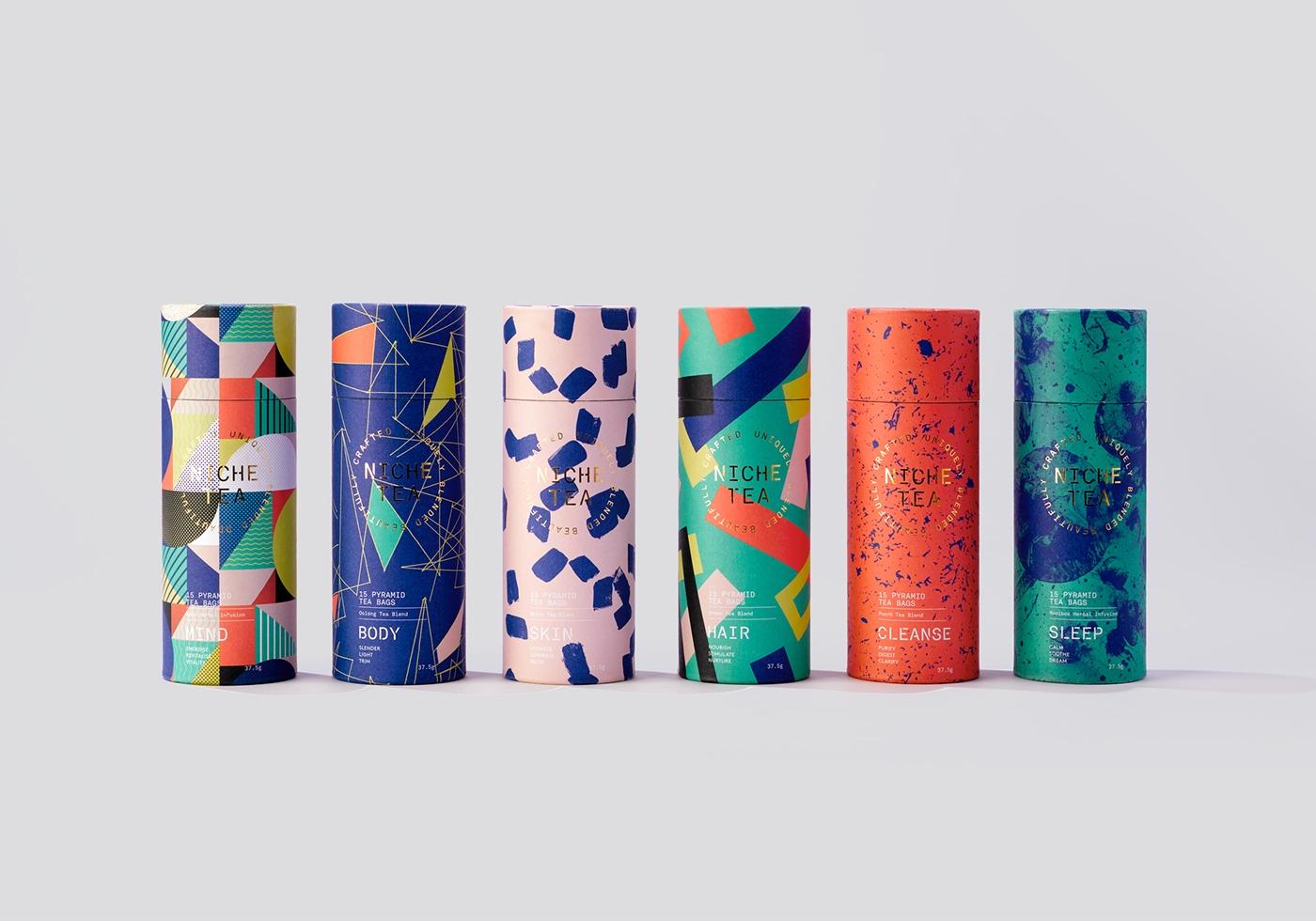 這個品牌的茶共有六個類型,不同于其他茶葉素雅的包裝,倫敦草本茶在包裝設計上分別采用對比色和同類色等鮮明的色彩,目的是營造出頭發、皮膚、睡眠、消化等癥狀改善后的青春活力的氣氛。整體的包裝設計充分利用了點線面三大元素,增添了產品的現代感。除此之外,產品包裝上還采用了茶的碎渣以及顯微鏡下茶的營養元素的圖案進行設計,迎合了天然健康的品牌文化。