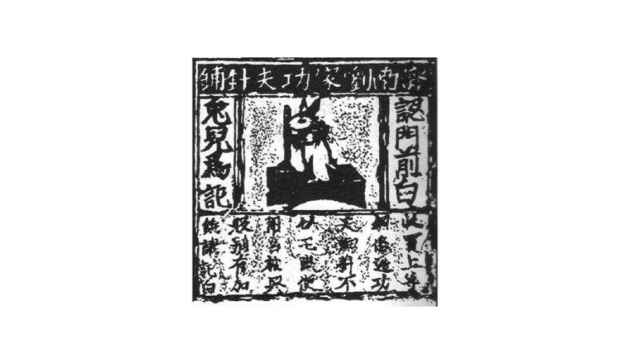 這是中國現(xiàn)存最早的一份印刷廣告,是宋代劉家功夫針鋪廣告,同時(shí)也是一張包裝紙, 銅版正中偏上刻著一只拿著鐵杵搗藥的白兔,白兔四周刻著密密麻麻的小字:上方為“濟(jì)南劉家功夫針鋪”;左右為“認(rèn)門前白兔兒為記”;下方為“收買上等鋼條,造功夫細(xì)針。不誤宅院使用,轉(zhuǎn)賣興販,別有加饒,謂記白”。文字皆為反刻,由此推測這塊銅版應(yīng)是用來印刷廣告的。它是集包裝紙、傳單、廣告三位與一體的設(shè)計(jì)形式,具有濃厚的商業(yè)色彩。