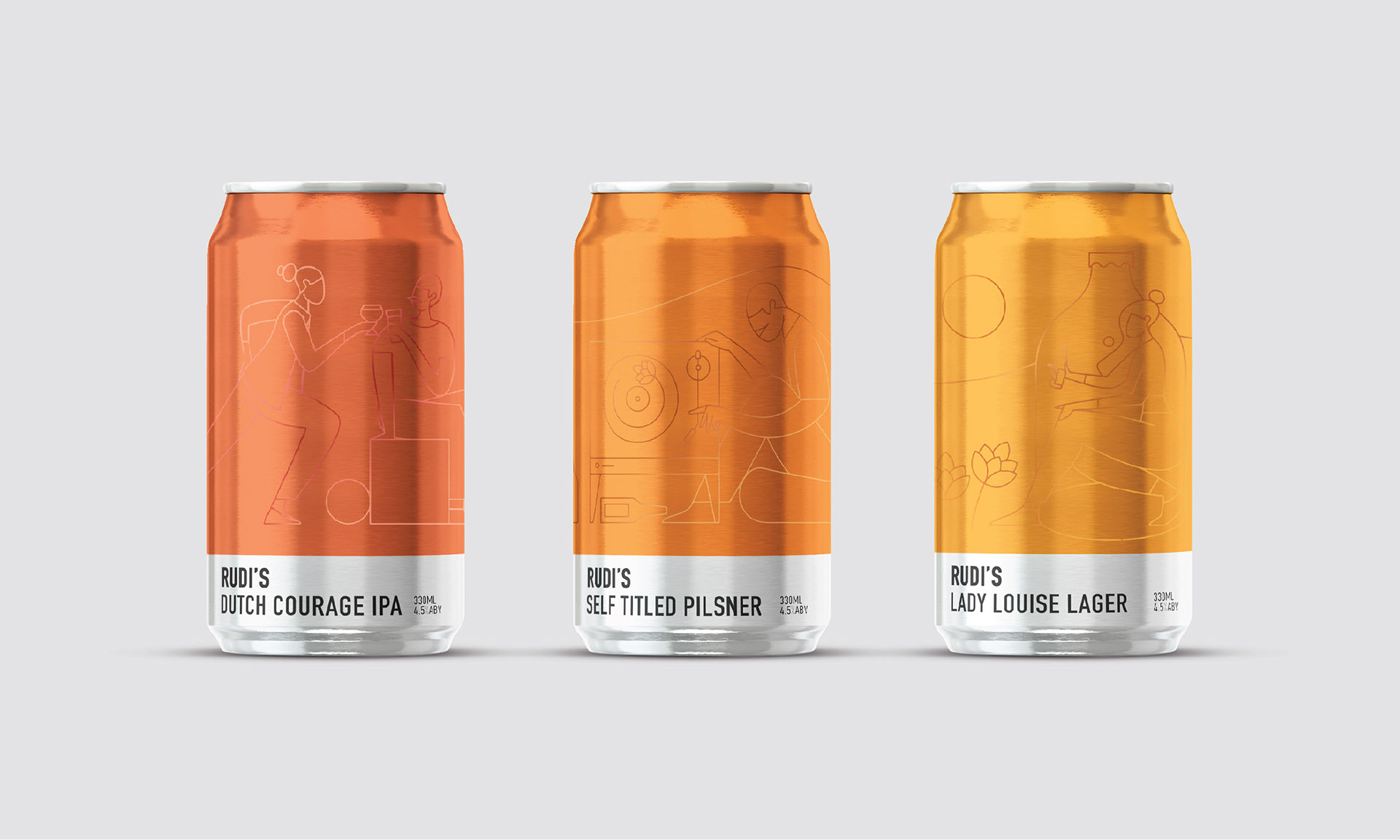 這是新西蘭的啤酒品牌Rudi's Beers包裝設計以紅、黃、橘三個暖色為主,傳達一種喝啤酒時的開心歡樂的情緒,再搭配鋁罐的金屬質地來呈現啤酒的濃郁醇厚,結合插畫的形式創造了一款獨特個性的包裝設計,在競爭激烈的精良啤酒市場中清晰的區分了他們的品牌。