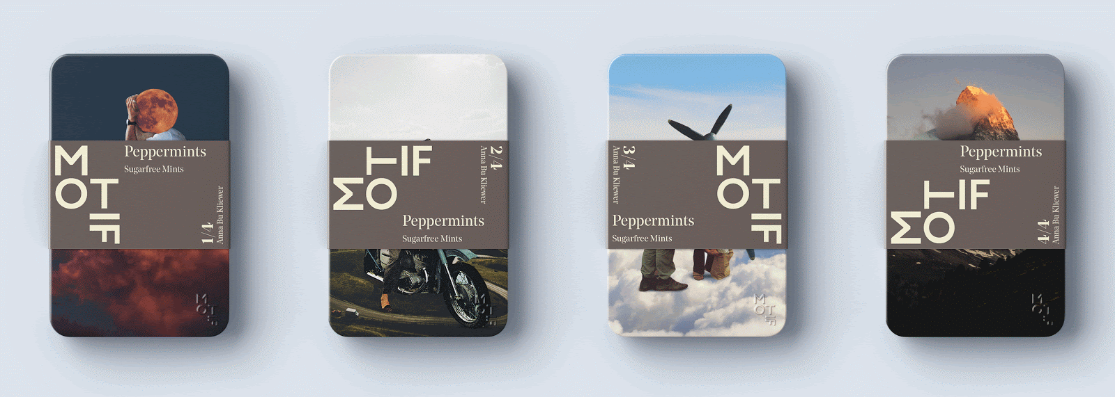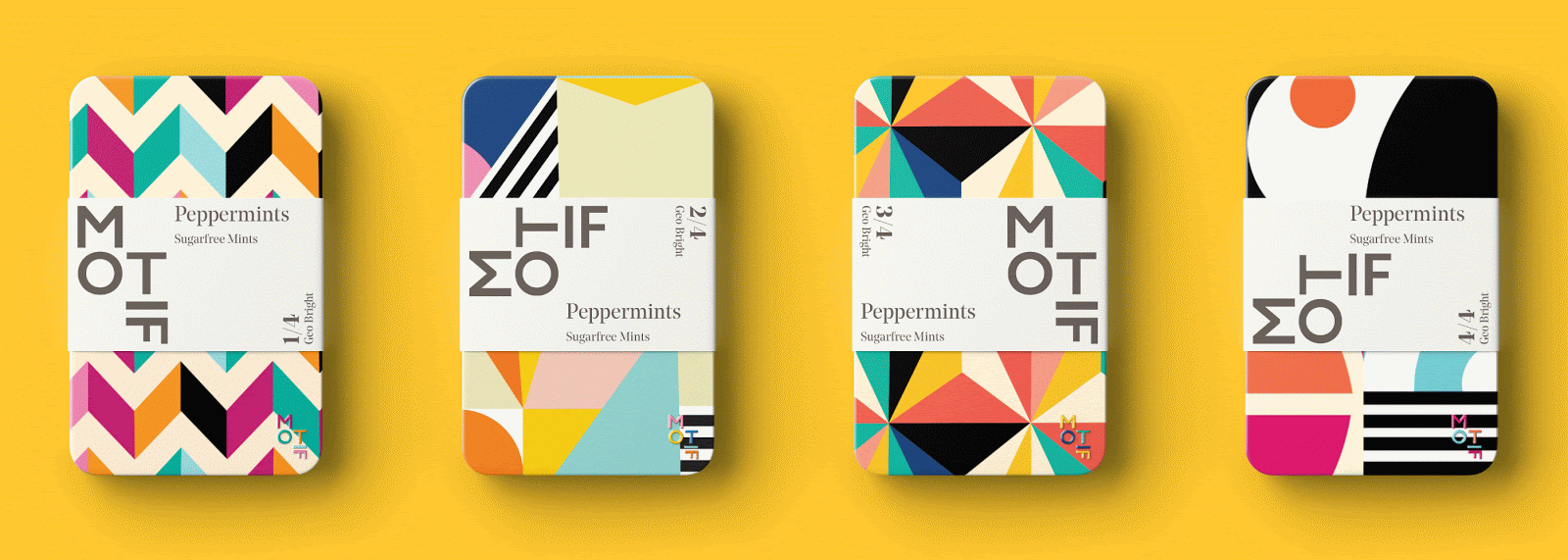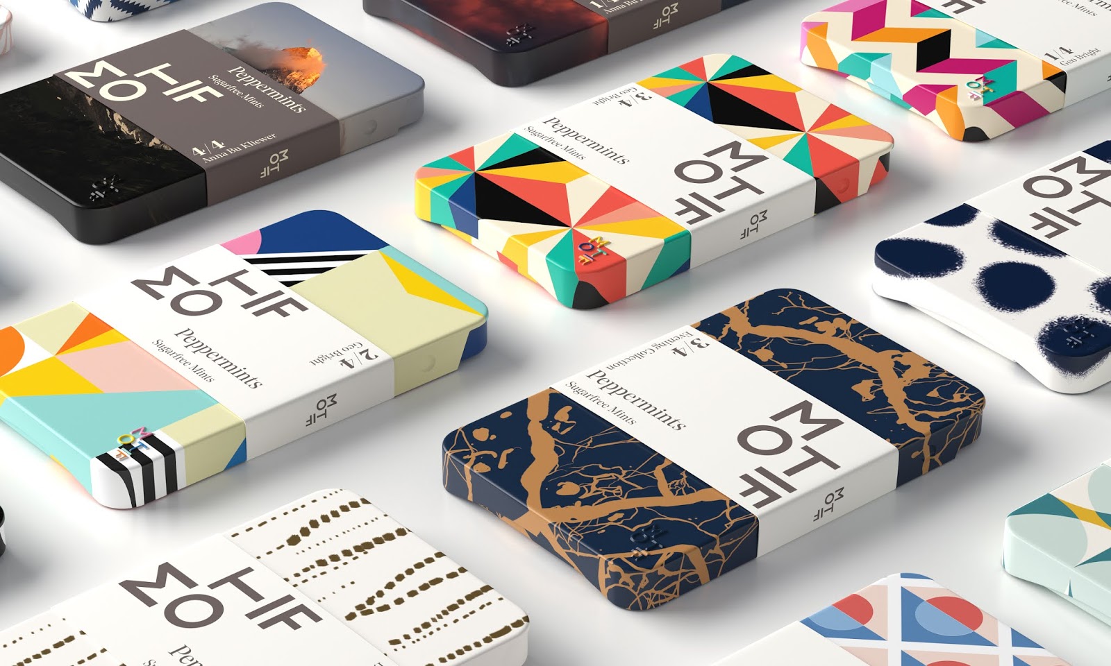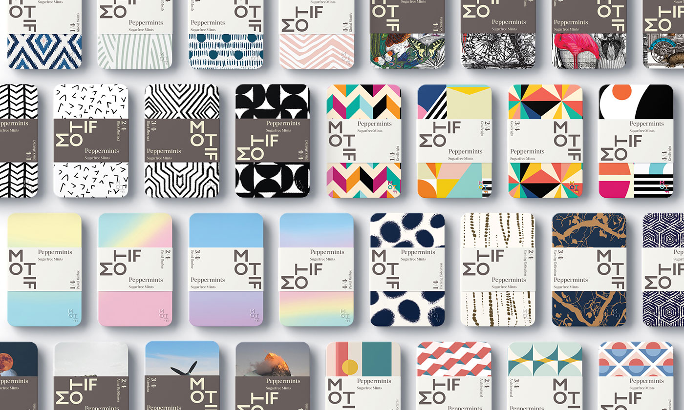 Motif薄荷糖包裝設(shè)計(jì),使用抽象的幾何元素與風(fēng)景人物進(jìn)行換位的方式,突出了薄荷糖,口味刺激多變的特點(diǎn)。