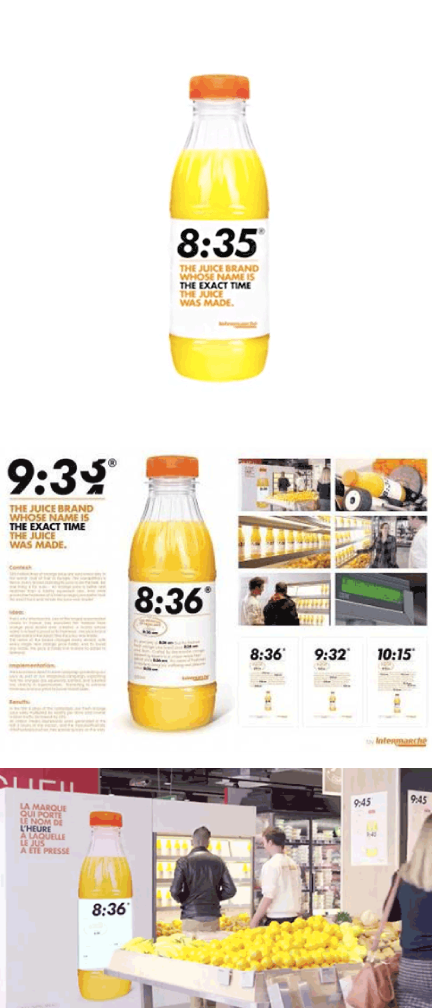 法國一家連鎖超市Intermarché的鮮榨柳橙汁,為表示其新鮮程度,直接就在瓶子的標簽上大大地印上了榨汁時間,每一瓶的榨汁時間都在變化。據報道,這瓶柳橙汁的逆襲,為超市增加了25%的來客數,而且因為這個成功的包裝設計,3小時就贏得了5000萬次的曝光量。