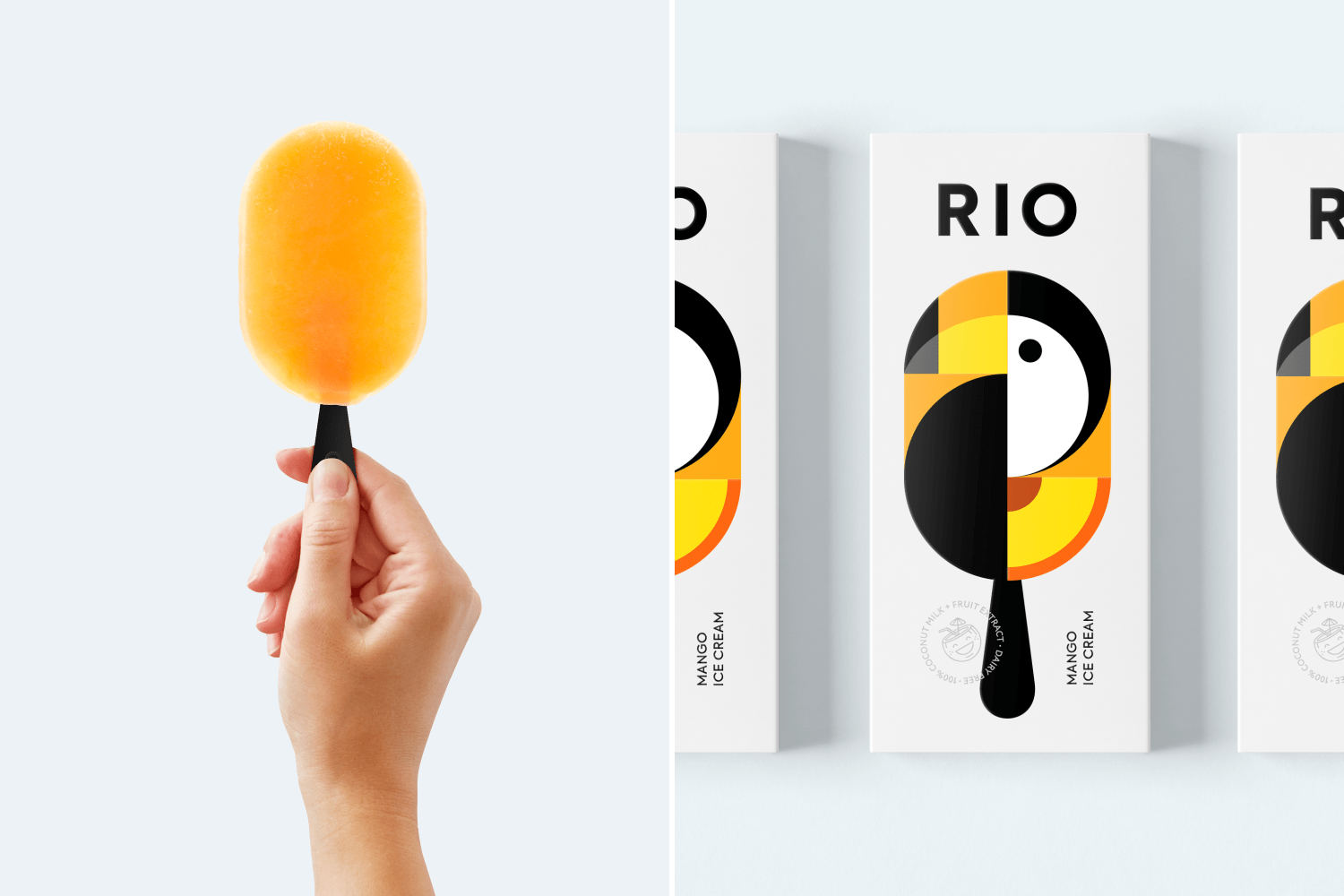 冰淇淋概念的靈感來自世界上色彩最豐富的城市之一里約熱內(nèi)盧。RIO冰淇淋反映了這座城市的主要特征明亮美味和陽光明媚。美麗的巨嘴鳥鳥也使我們想起了里約熱內(nèi)盧的主要吉祥物。包裝的主要思想是傳達其美味的味道及其天然成分,簡單的圖形成獨特的識別符號,加速人們的聯(lián)想,使人印象深刻。