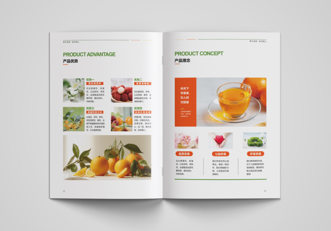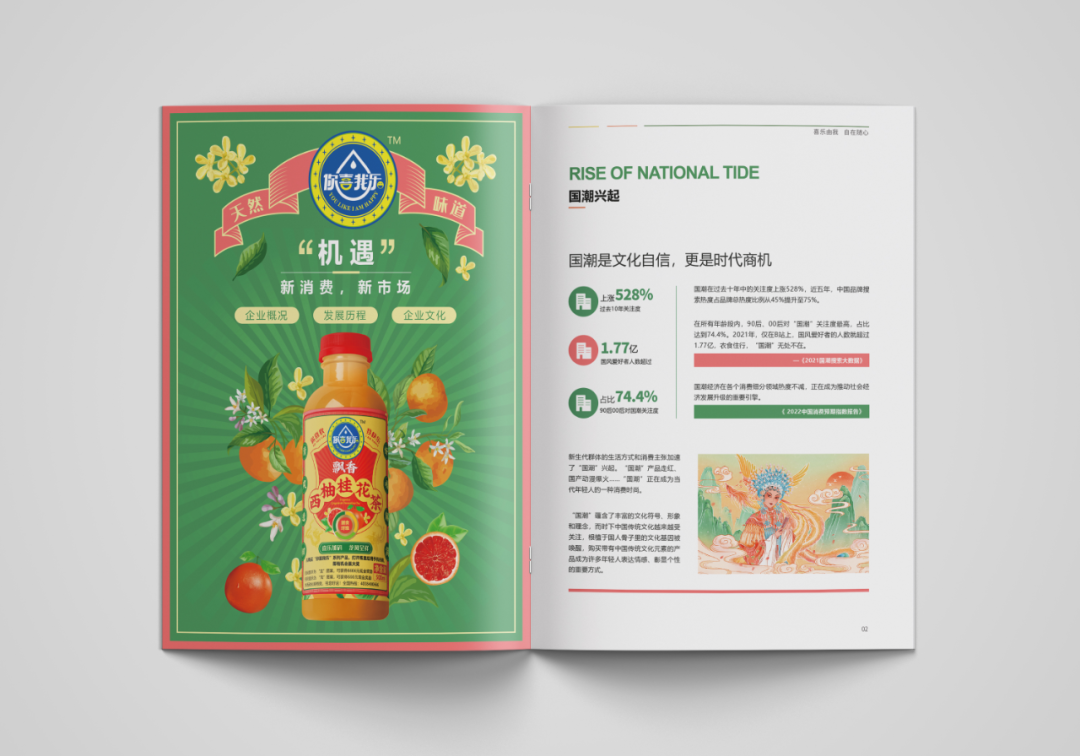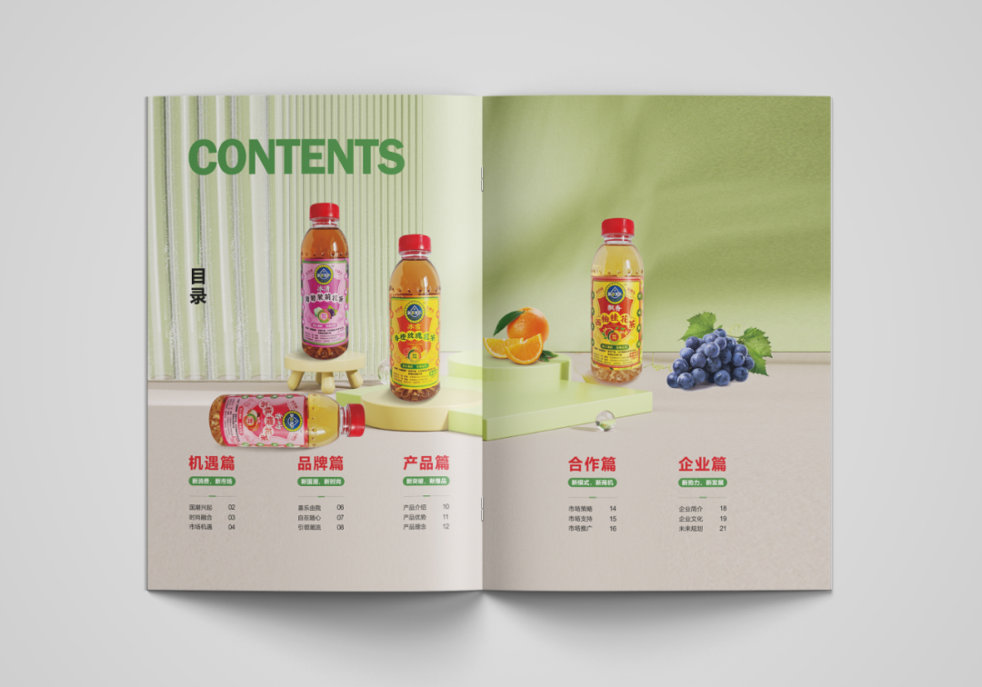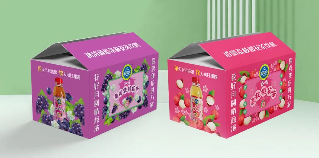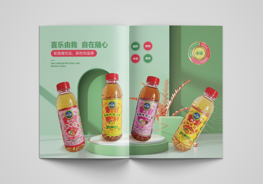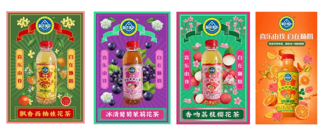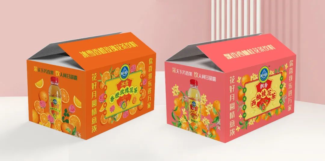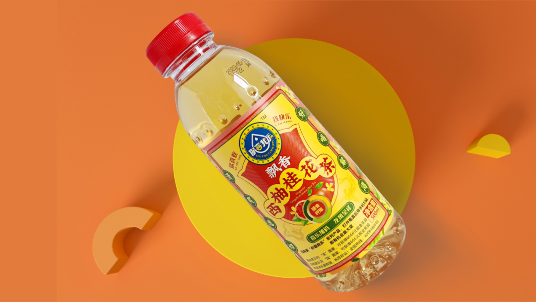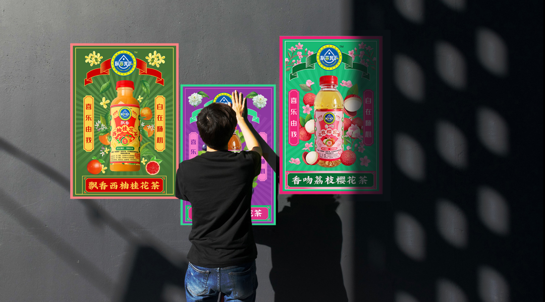 創造超級花邊,花邊的任務就是抓住消費者的眼球,紅綠黃三種顏色的碰撞,耀眼醒目,強制消費者看過來,實現驚鴻一瞥的視覺效果,其次建立起品牌的獨特資產。四周以果味花茶飲料產品本身的原色為主色調,富有強烈的視覺沖擊感,帶給消費者充滿浪漫感的情緒互動。西柚+桂花+茶,環繞四周,以高明的綠色和金色作為輔助色系,大膽的用色加深觀眾的情緒互動。