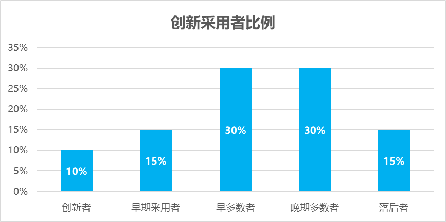 品類創(chuàng)新并不意味著就能獲得市場的認(rèn)可,因?yàn)橄M(fèi)者的認(rèn)知并不是純粹理性,而是受到個(gè)人認(rèn)知、需求、個(gè)性、經(jīng)濟(jì)、社交、文化等各個(gè)層面的影響,不同的消費(fèi)者接受創(chuàng)新產(chǎn)品所需的時(shí)間和條件是不同的,基于該特點(diǎn),社會(huì)學(xué)家提出了著名的“創(chuàng)新采用者理論”,即消費(fèi)者可劃分為五個(gè)類型——?jiǎng)?chuàng)新者、早期采用者、早期多數(shù)者、晚期多數(shù)者和落后者。五大類別消費(fèi)者的平均占比服從統(tǒng)計(jì)學(xué)上的正態(tài)分布:創(chuàng)新者10%、早期采用者15%、早多數(shù)者30%、晚期多數(shù)者30%、落后者15%。